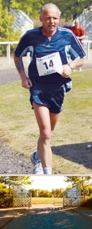 Den 42-årige grenaaenser Søren Rønn Hansen løb 66 km. i forbindelse med Vamdrup Motions 6-timers løb Bededag. -- Der blev løbet på en 2,64 km. lang rundstrækning i Vamdrup - herunder Vamdrup Stadion, som man her ser hovedindgangen til. 25 gange nåede Søren Rønn Hansen at passere denne portal inden løbet var slut.